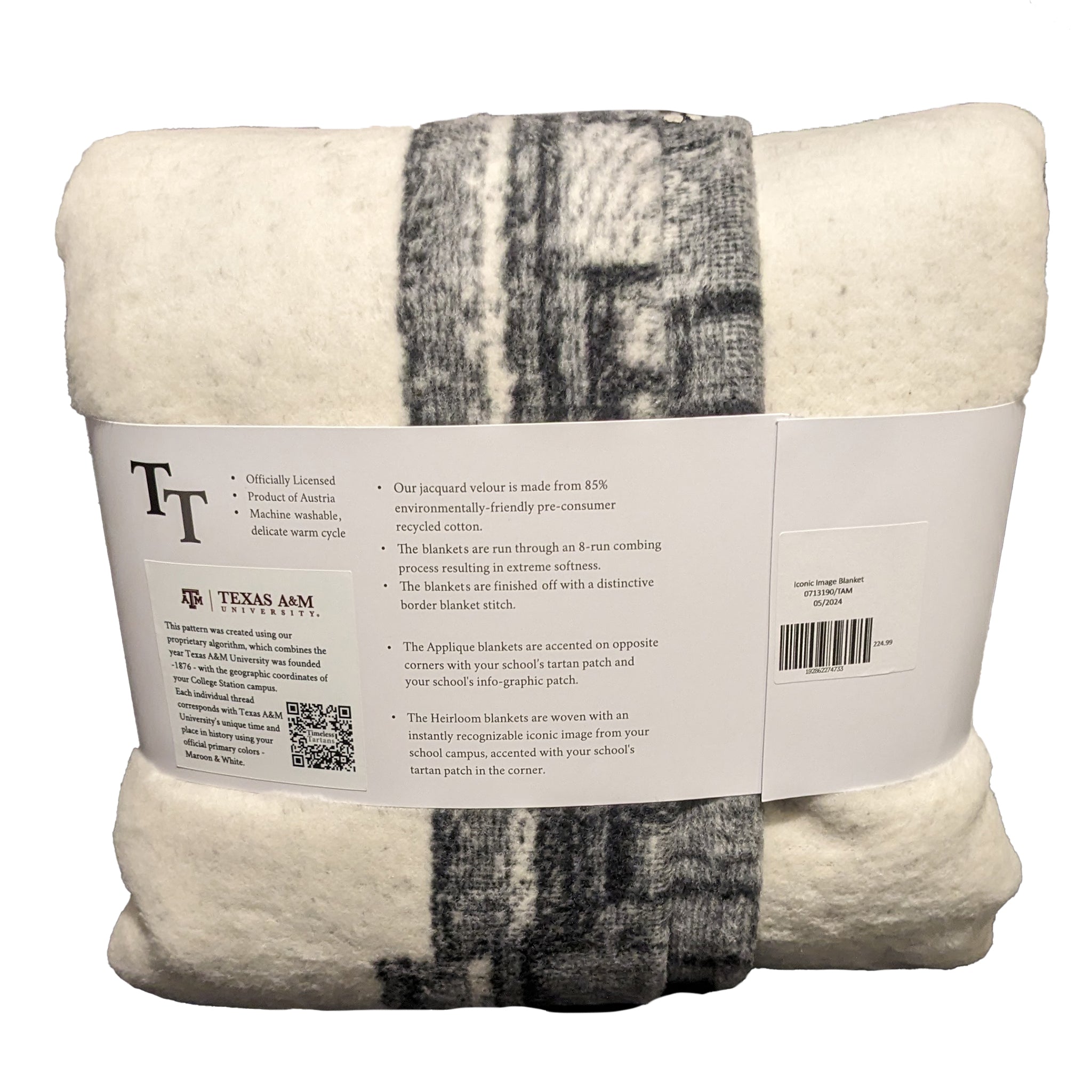 Looking to add a collegiate heirloom to your decor? You’ll love this custom jacquard velour blanket featuring TAMU’s iconic Academic Building, woven into yarn made from 85% environmentally-friendly pre-consumer recycled cotton. Our blankets are run through an 8-run combing process, giving them a luxurious softness.