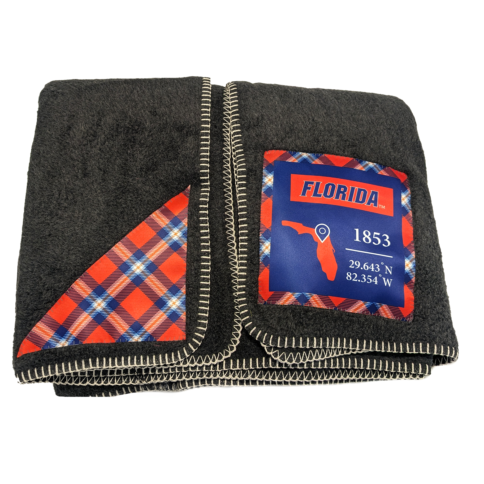 Our heirloom blankets make perfect gifts for incoming freshmen, graduating seniors, alumni of any age, honoraria, and much more. These large blankets are finished off with a distinctive border blanket stitch, accented in one corner with UF's tartan patch and your school’s infographic patch in the opposite corner. Our patented algorithm combines UF's founding year and campus coordinates with its official colors to create a unique, meaningful tartan pattern you’ll cherish for years to come.